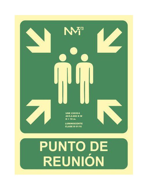 Señal de seguridad Punto de Reunión fabricada en polipropileno de 700 micras de espesor. Homologada según normativa. Serigrafiada a 1 tinta + fotoluminiscente clase B. Medidas: 224x300mm.