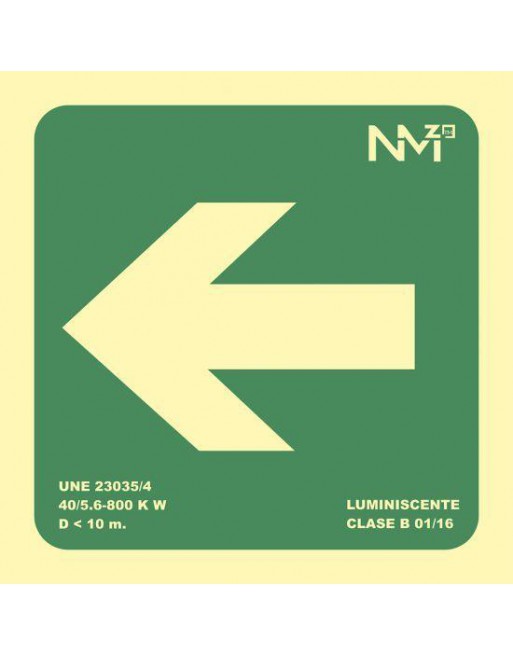 Señal de seguridad Flecha Izquierda fabricada en polipropileno de 700 micras de espesor. Homologada según normativa. Serigrafiada a 1 tinta + fotoluminiscente clase B. Medidas: 224x224mm.
