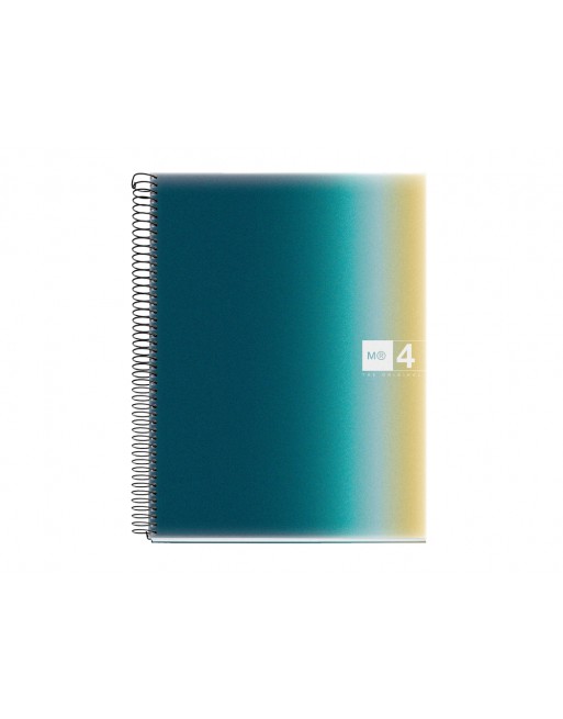 Cuaderno Miquelrius, tamaño A4 (210 x 297 mm). Cubiertas: Polipropileno translúcido impreso de 0,8 mm. Espiral: Metálica continua que permite la apertura en plano del cuaderno, además de dar la vuelta completa, y con cierre coilock que evita enganches. Papel interior: extra opaco de 70 g/m², evita que la tinta traspase y seca rápidamente. Hojas: 120 hojas con banda de color en el lateral (4 colores, 30 hojas por color), ideales para poder clasificar apuntes y usar un color para cada asignatura, cabecera para títulos, microperforado para un arranque limpio y 4 Taladros: para archivar. Rayado: Cuadrícula 5 mm. Consultar disponibilidad en formato A5 y/o impresion interior de 1 linea.